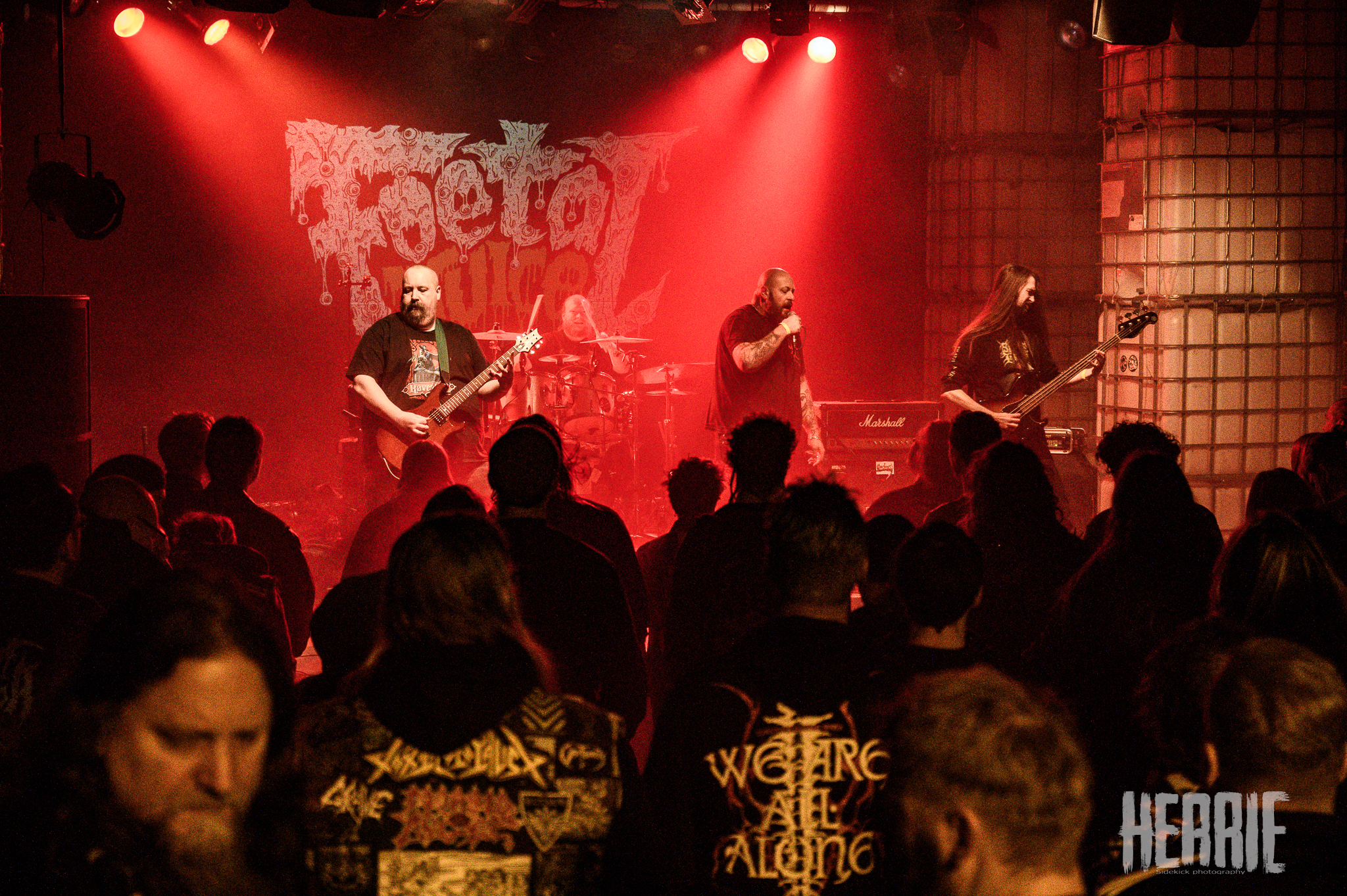 Foetal Juice uit Engeland, brengt stevige mannen op het podium. Rauw ongepolijst en agressief. Frontman Dez doet zijn best om wat beweging in de set vol violent grinding death metal te krijgen. Maar echt los komt het niet. De rest van de band oogt ook wat statisch en het geluid wat eentonig. Het is een golf van agressie die niet, op een enkele mosher na, iedereen lijkt te voelen. Maar gezamenlijk bier drinken, doet gestaag het publiek opwarmen voor de gemoedelijke frontman met woeste vocalen, wat resulteert in toch een rammend pitje tegen het einde van de show.