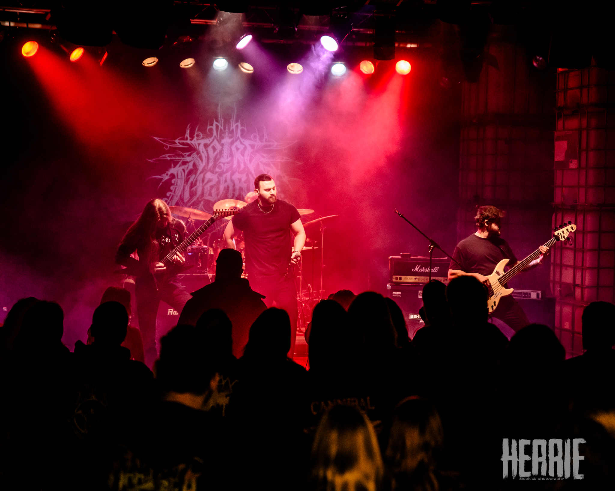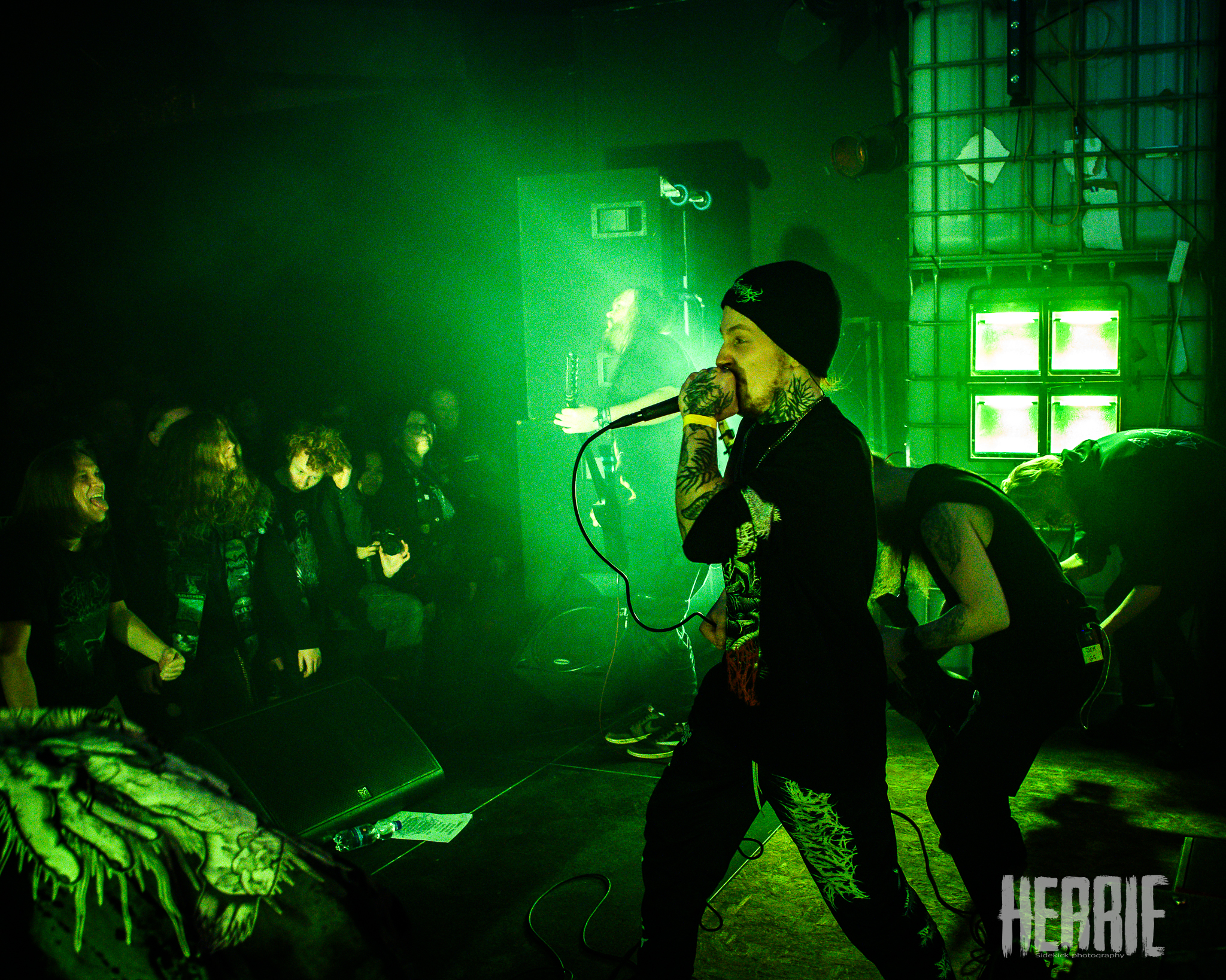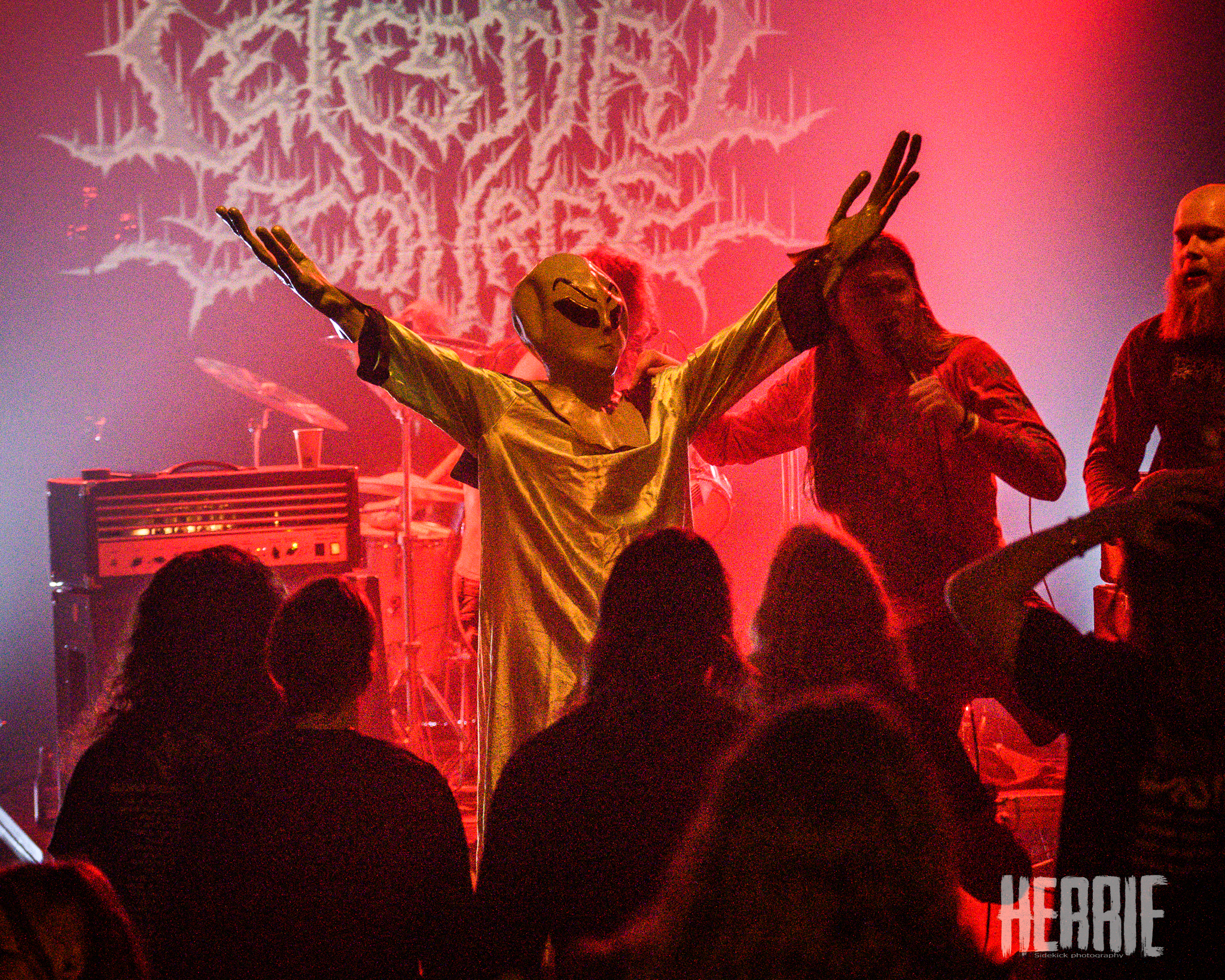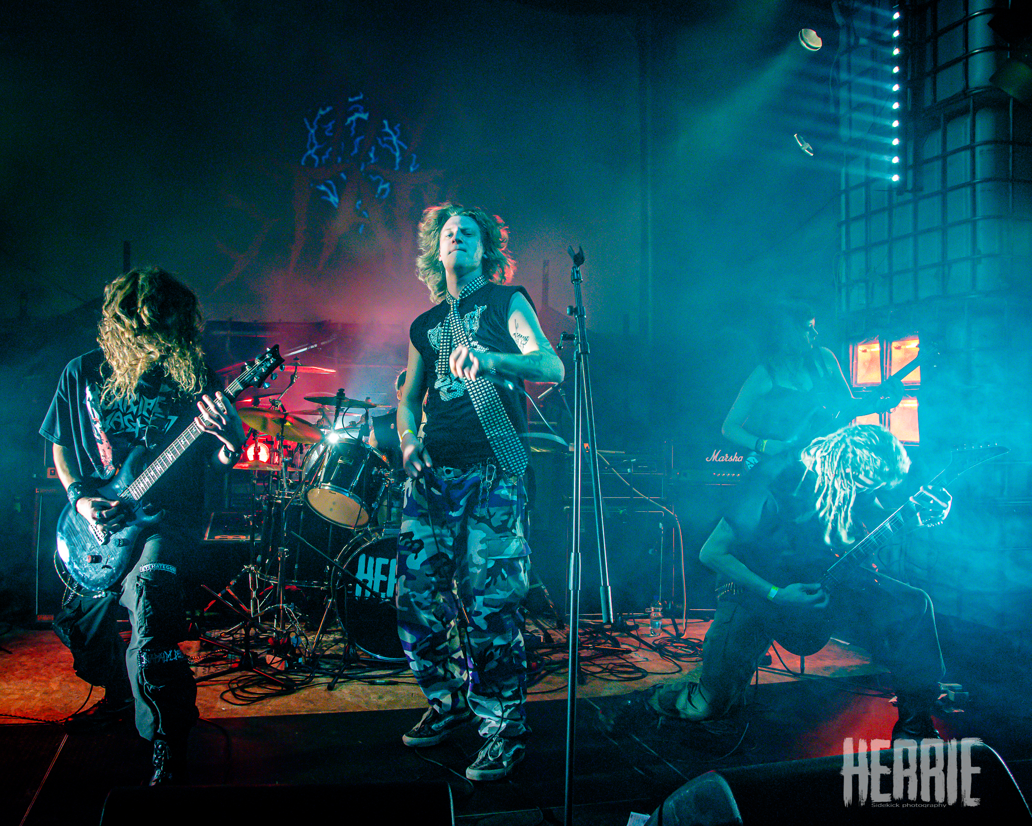 Celestial Scourge uit Noorwegen, opent lekker agressief. Het is hun eerste show op Nederlandse bodem. De indrukwekkende vocalen van zanger Eirik Waadeland weten gelijk het nodige publiek naar voren te bewegen. (Deathmetal). Het rappe drumwerk van Kristoffer Lunden is in ieder geval moeilijk te volgen voor de bangers. De up tempo technical deathmetal slaat aan, en nu de metalmanen nog niet voorzien zijn van zweet en bier wappert alles lekker soepel rond. Met het rappe tempo ontvlamt de boel in ieder geval wel. Zanger Eirik vindt het hier “Cold as fuck”. Toch lijkt niet iedereen in de band die mening te delen, waar de gitarist shirt loos op het podium staat. De set en “Skål” wordt goed ontvangen. Met recht want Celestial Scourge zet een toffe show neer. Het is een warm welkom hier op Herrie! Ze zijn een absolute sfeer maker tot dusver. Tijdens het laatste nummer doet er nog een alien mee op het podium en in de pit. Een extra wat de band niet nodig leek te hebben, maar zeker een leuke toevoeging.