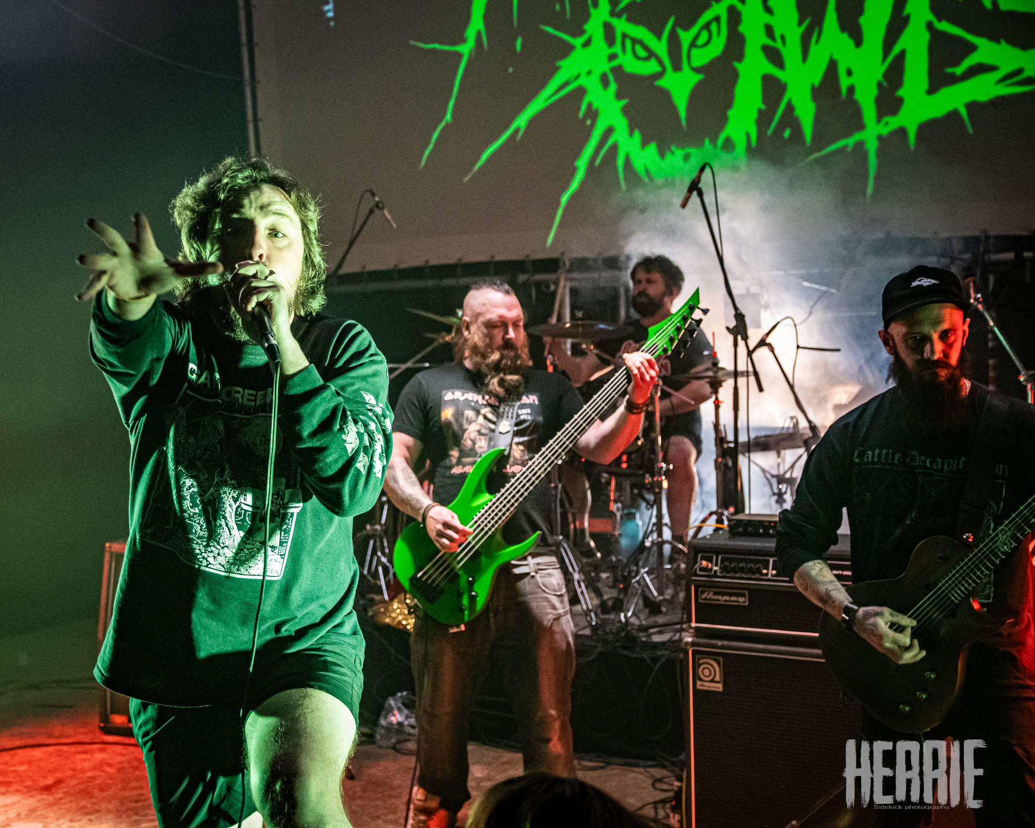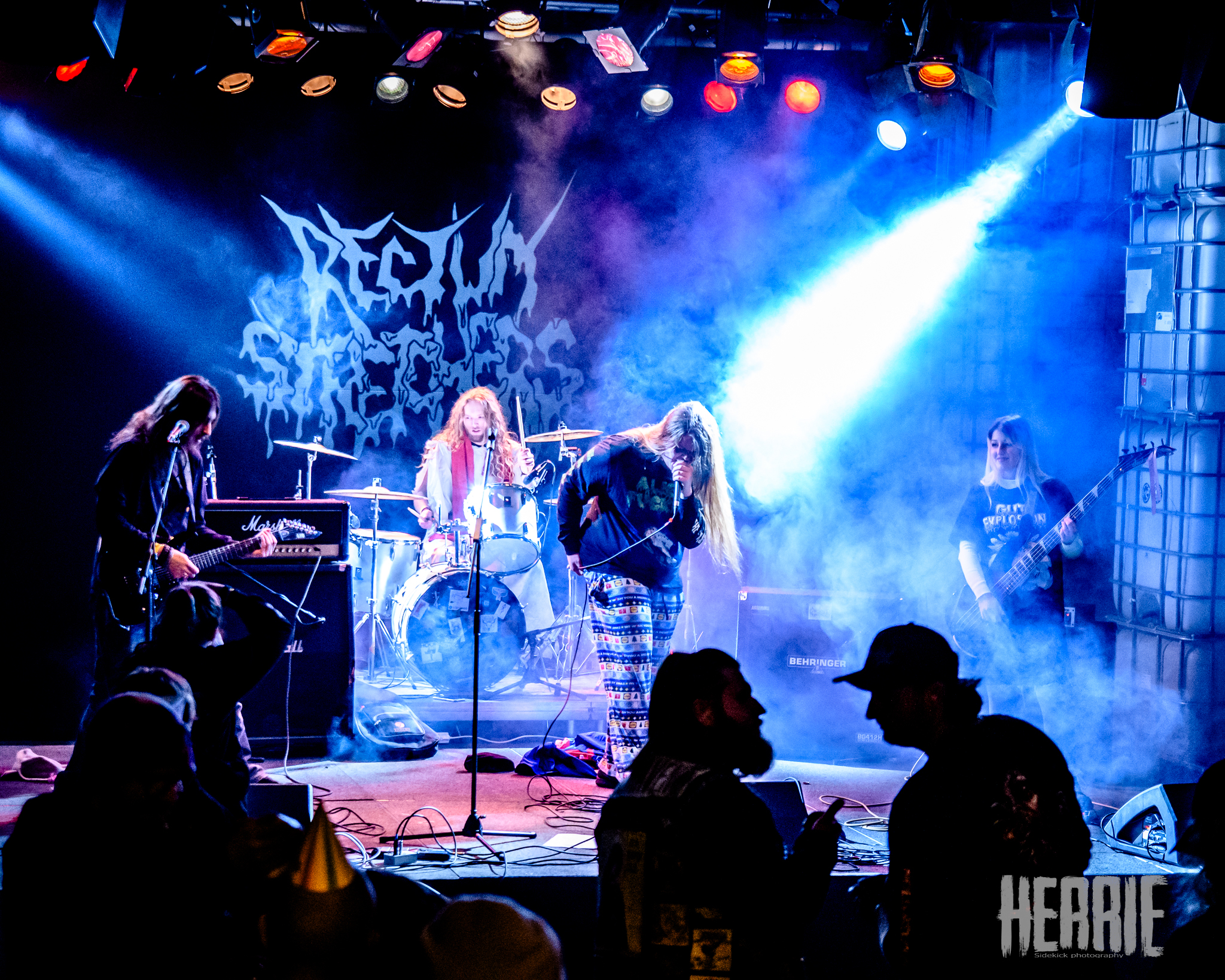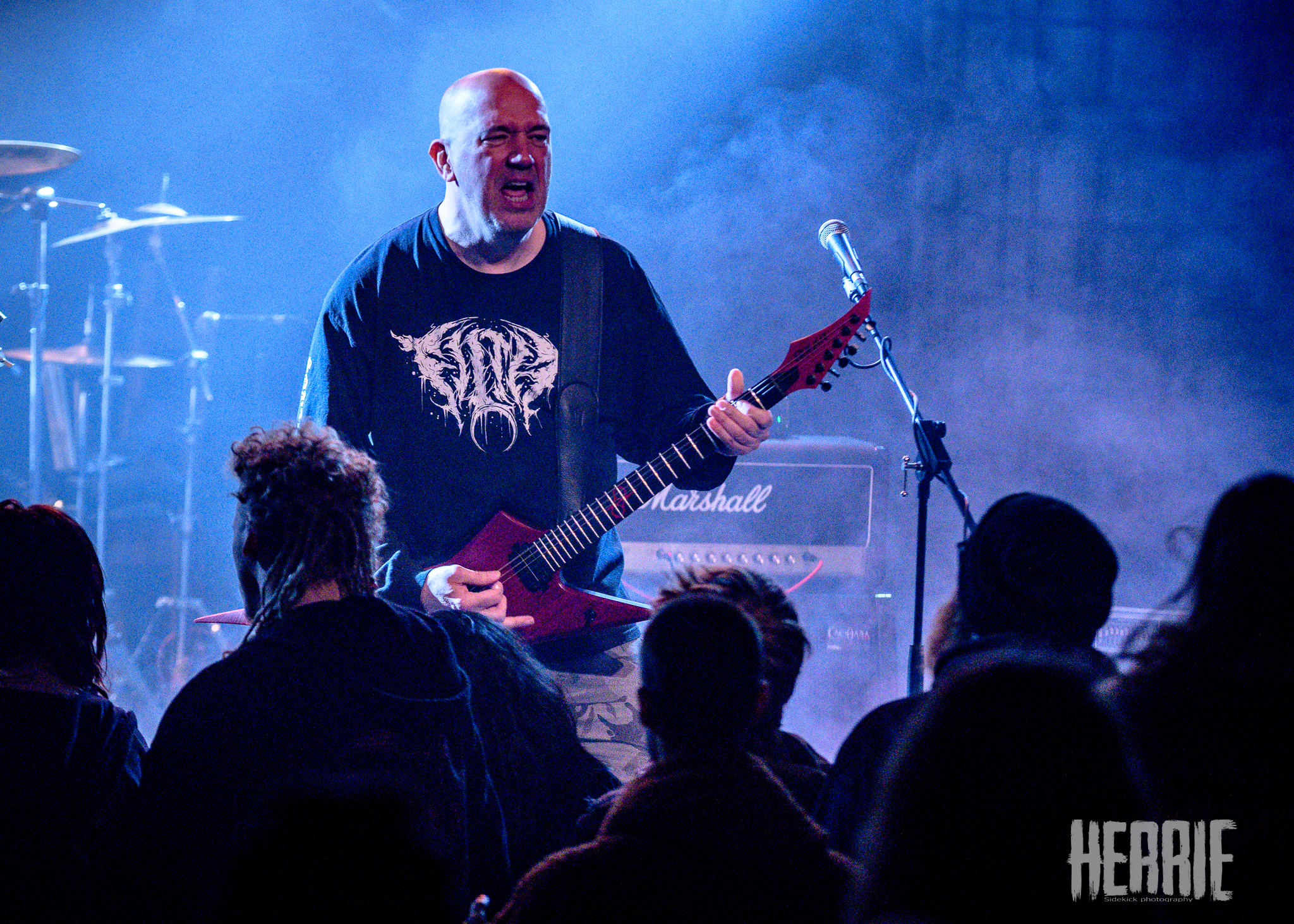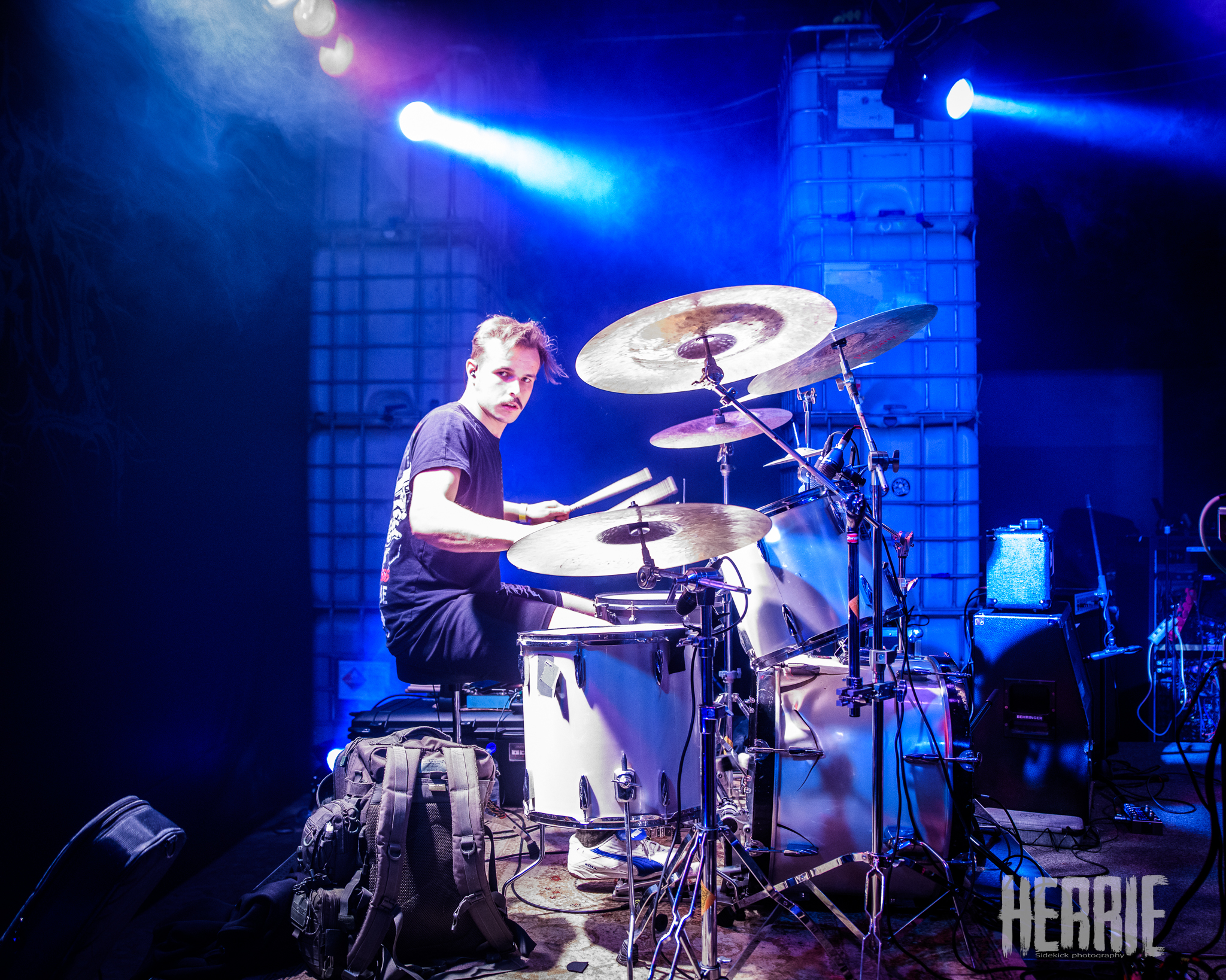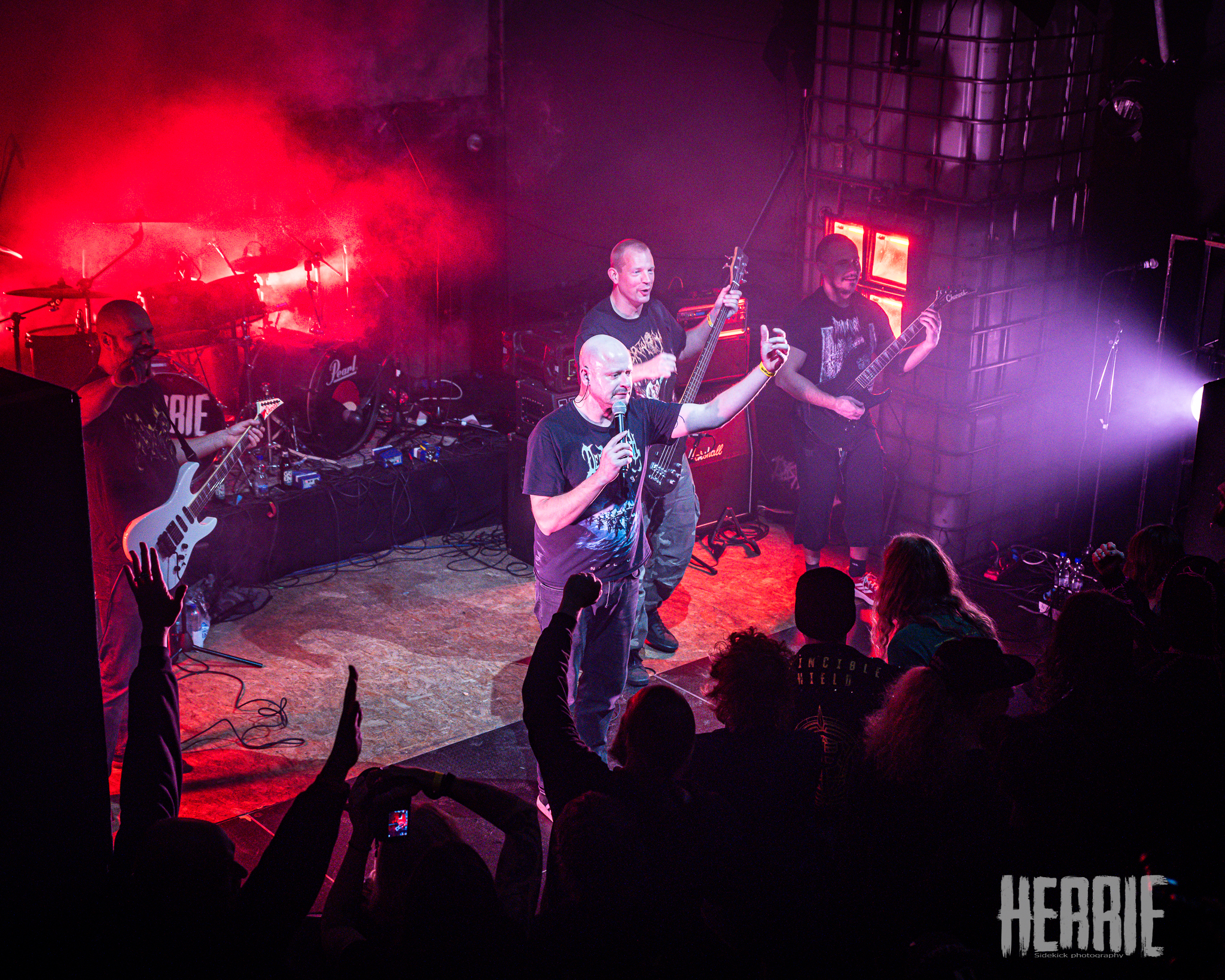 Celestial Scourge uit Noorwegen, opent lekker agressief. Het is hun eerste show op Nederlandse bodem. De indrukwekkende vocalen van zanger Eirik Waadeland weten gelijk het nodige publiek naar voren te bewegen. (Deathmetal). Het rappe drumwerk van Kristoffer Lunden is in ieder geval moeilijk te volgen voor de bangers. De up tempo technical deathmetal slaat aan, en nu de metalmanen nog niet voorzien zijn van zweet en bier wappert alles lekker soepel rond. Met het rappe tempo ontvlamt de boel in ieder geval wel. Zanger Eirik vindt het hier “Cold as fuck”. Toch lijkt niet iedereen in de band die mening te delen, waar de gitarist shirt loos op het podium staat. De set en “Skål” wordt goed ontvangen. Met recht want Celestial Scourge zet een toffe show neer. Het is een warm welkom hier op Herrie! Ze zijn een absolute sfeer maker tot dusver. Tijdens het laatste nummer doet er nog een alien mee op het podium en in de pit. Een extra wat de band niet nodig leek te hebben, maar zeker een leuke toevoeging.