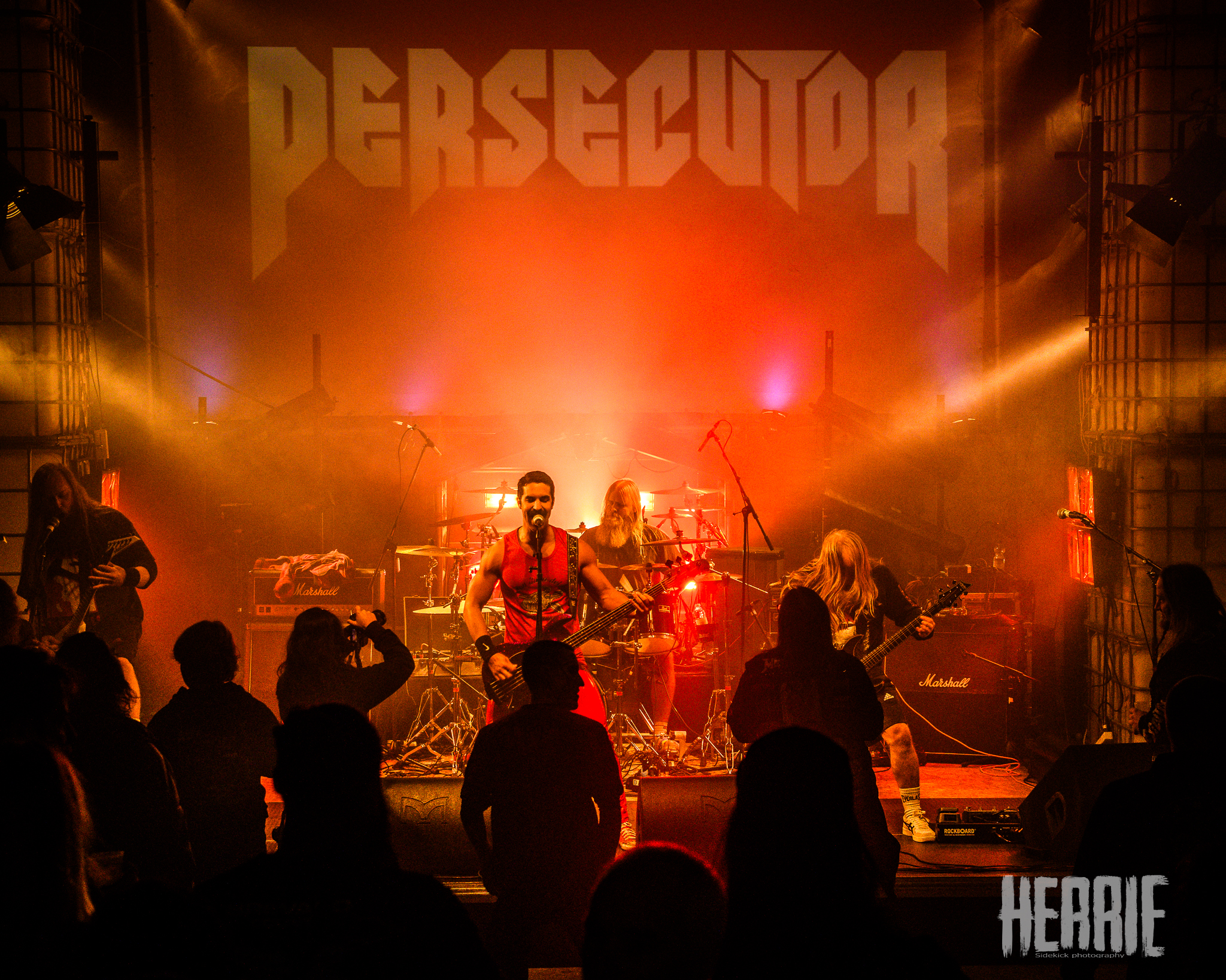 De zanger van Persecutor is tussen alle zwarte gewaden een bijzondere verschijning die in zijn rode outfit en met een jaren 80 befborstel, wel iets weg heeft van Freddy Mercury, maar dan met spierballen en zware gitaren. Deze thrashers, laten er geen gras over groeien. Stoere poses en een krachtig geluid, alles lijkt te kloppen. Het show element is in ieder geval hoog en het publiek komt graag dichterbij voor ‘4 More Beers’. Echt mee gezongen wordt er vervolgens niet, wat jammer is want de heren werken er hard genoeg voor. Het enthousiast gegooide plectrum had dan ook beter naar die ene fan inclusief vlag voor het podium kunnen gaan. In plaats van doelloos een plek te vinden op de koude betonnen vloer. Persecutor lijkt de pech te hebben na Celestial Scourge op te treden. Want het is zeker geen slechte show, waarbij de heren zelf in ieder geval zichtbaar genieten op het podium. Uiteindelijk weten ze met wat glad solo werk en een hoog oh ho gehalte toch de Hal mee te laten blèren. Wat de terechte gezellige vibe neerzet.