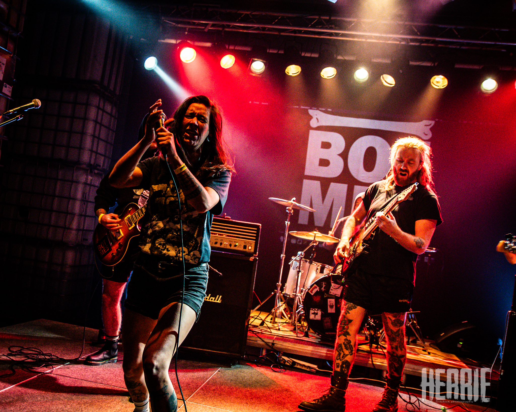 Op de bouwplaats volgt Bot Mes al snel om hierin te voorzien. De bandleden van deze brutal hardcore/ punk formatie hebben het koud. Bijzonder genoeg zijn ze dan ook in korte broek gekleed. Zangeres Kim moshed voor het podium, ongetwijfeld om warm te worden. Ze brengt indrukwekkende klanken terwijl ook bassist Nangko het podium verruild voor de vloer. Nou ja podium hier op Herrie scheelt dat 50 cm, om de boel lekker toegankelijk te houden. Ondertussen lijken de bandleden op te warmen. Want zij brengen de rammende energie. Langzaam volgen er zo ook wat bangers voor het podium. Het is hard werken, want het grootste deel van het publiek lijkt vooralsnog wat bevroren. Terwijl de liefelijke klanken van zangeres Kim toch hartverwarmende boodschappen tegen Johan Derksen en Thierry bevatten.