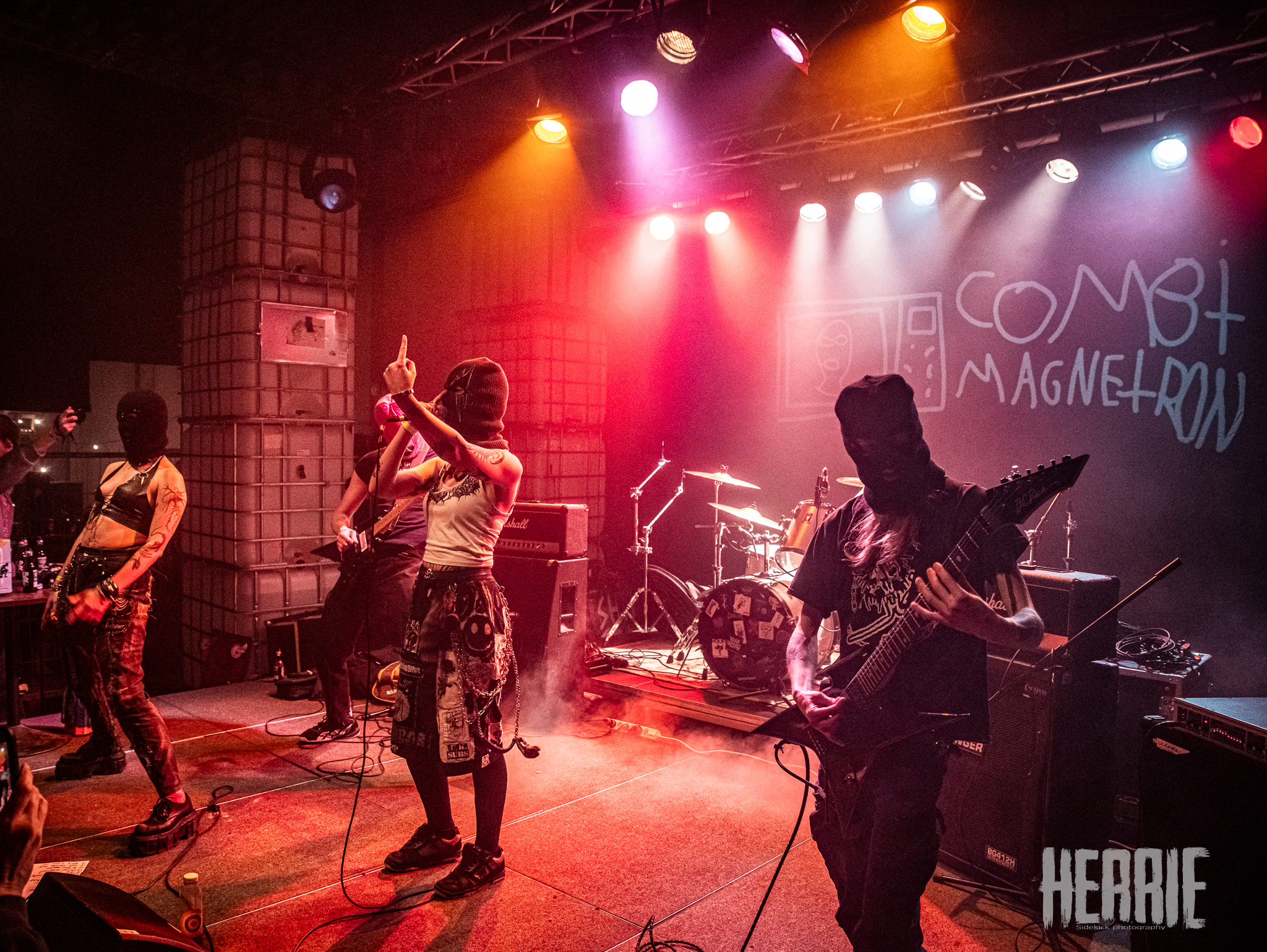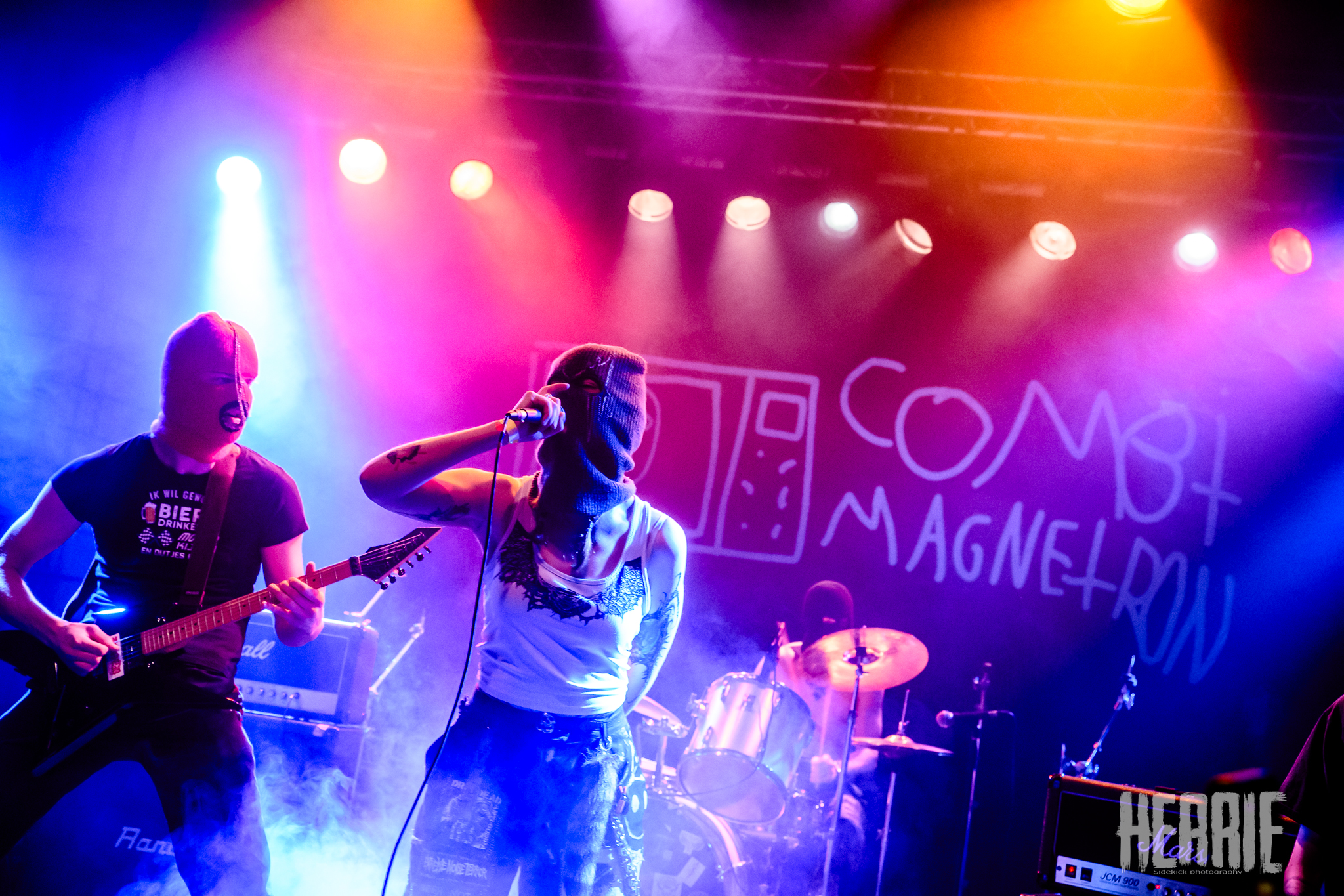 De timer van de Combi Magnetron stond kennelijk niet helemaal goed afgesteld, want de gitaristen waren te laat. Maar plug and play, let’s go. Ping! De shirts gaan uit en de bivakmutsen op. Dat naast gitaargeweld er ook vega broodjes worden aangeboden door de band, is alleraardigst. Hiervoor staat er daadwerkelijk de gehele show een dame op het podium, die al dansend de broodjes opwarmt in je raad het al…de combimagnetron. Deze broodjes vliegen je letterlijk om de oren, op de brute teksten gebracht door de indrukwekkende strot van de frontvrouw. Dit grind, mincecore gezelschap heeft een duidelijke boodschap, en zijn gekomen om die met rammend geweld over te brengen. Deze uptempo smaakmaker weet de bouwplaats al snel vol te trekken met enthousiaste feestbeesten. Fuck Amsterdam, toeristen, de overheid, Albert Heijn, vrouwen moet je scharen! Duidelijke statements, die hun weg vinden in de ontvlamde moshpit. Combi Magnetron bepaald de sfeer! Dit is rauw ongepolijst en goed!