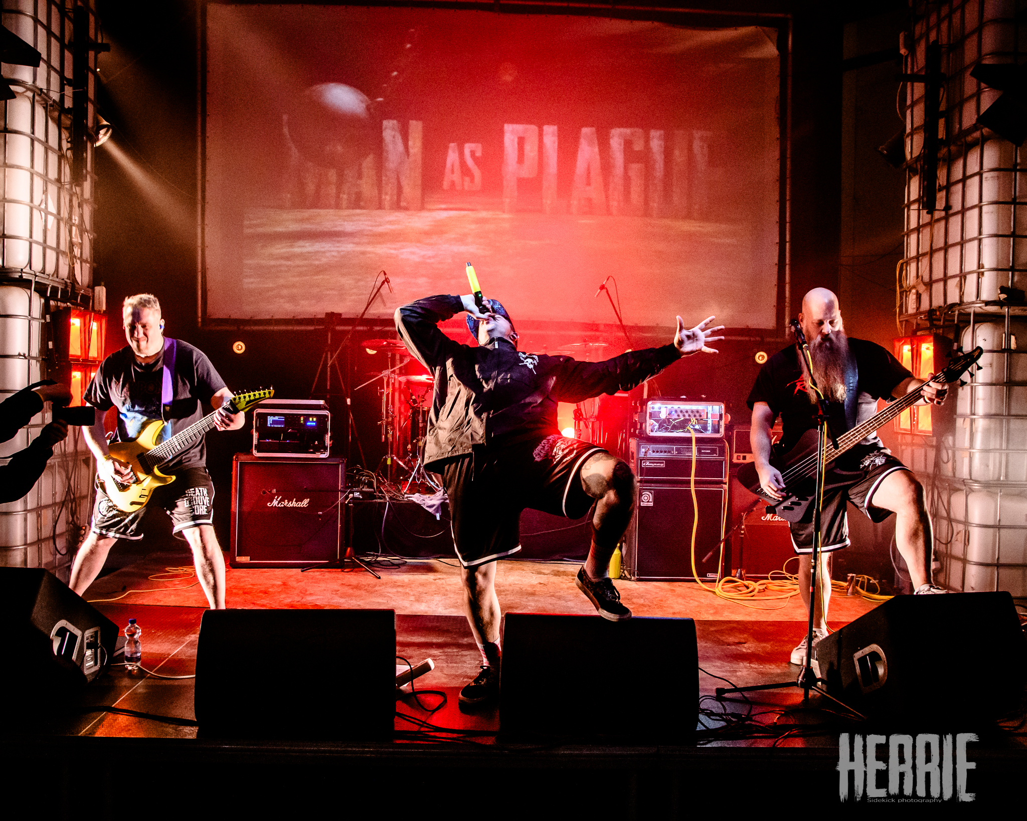 Man as Plague is vervolgens aan zet in de Hal, deze death metal/ deathcore/ hardcore formatie wint er geen doekjes om. Uptempo en krachtig betreedt men het podium. Frontman Tim Koole zoekt actief het publiek op en toont naast knappe grunts ook imposante bewegingen / poses op het podium. Je moet tenslotte wel warm blijven. Het kost wat moeite om het toegestroomde publiek hiervan te overtuigen, maar na wat aanmoedigen wil het circle pitje toch gestaag opstarten, nadat hij hier zelf aan deel neemt. Het gastoptreden van de zanger Perry bekend van Twice the Same, wat een random collega van Tim blijkt te zijn, blaast de show extra energie in. Deze samenwerking is wel één van de highlights van dit optreden. Hierna gaat de Hal mee in de vibe van de band en weet men de energie vast te houden. Man As Plague sluit af met krachtige energie die ook het publiek voelt.
